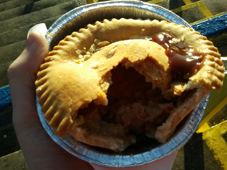 Comments: I couldn’t decided between which photo to put up as they are both ruddy glorious so it gets both. A spanking effort from the home of the Silkmen, a giant of a pie that a near perfect effort. Avoiding the usual hazards of meat and potato this was both incredibly tasty due to its generous filling, a perfect balance inside it avoided being like dirty mash. Conquering all levels of hunger the pie had a charming home made feel about it, simply what footballing pies are all about.