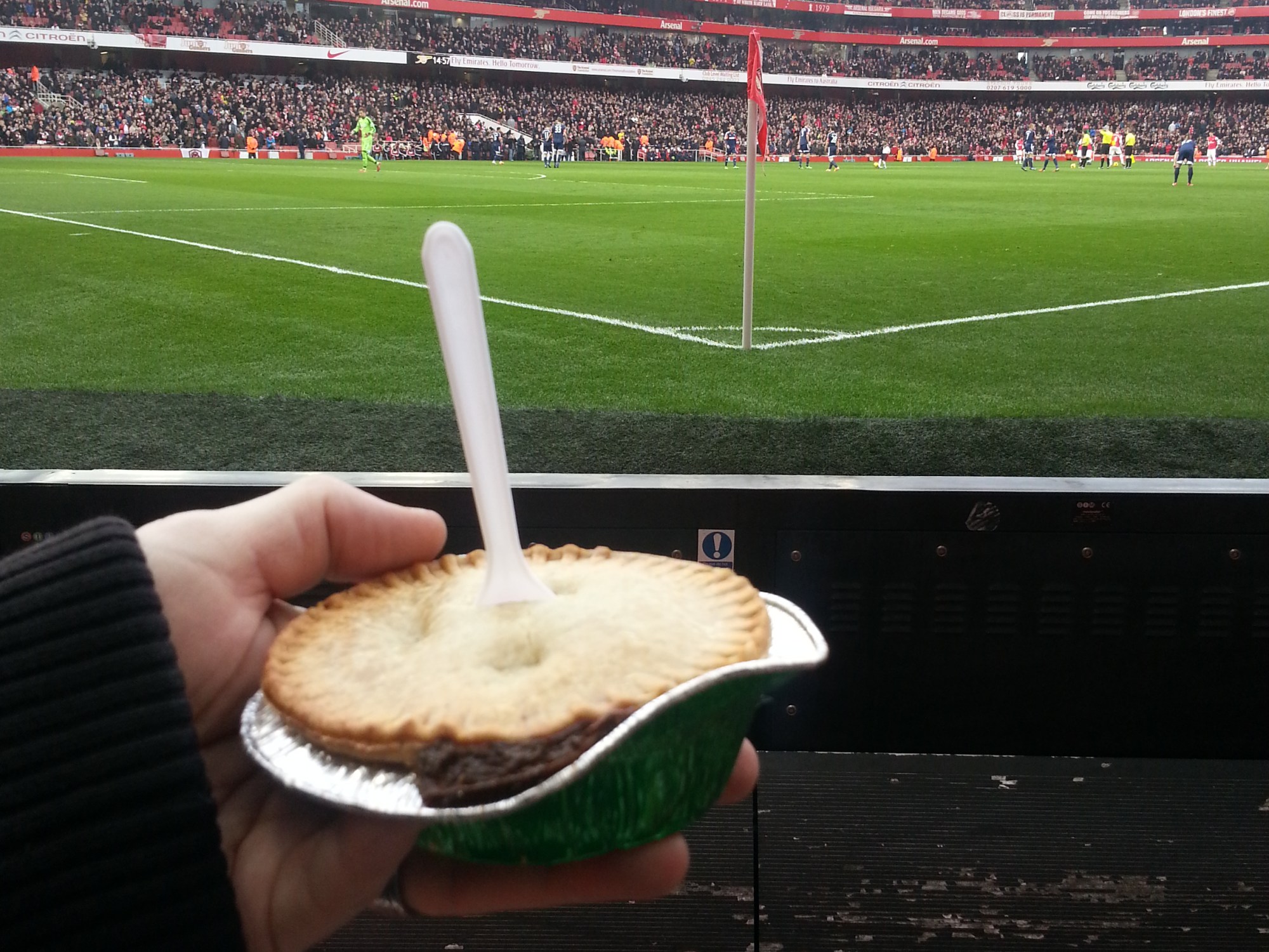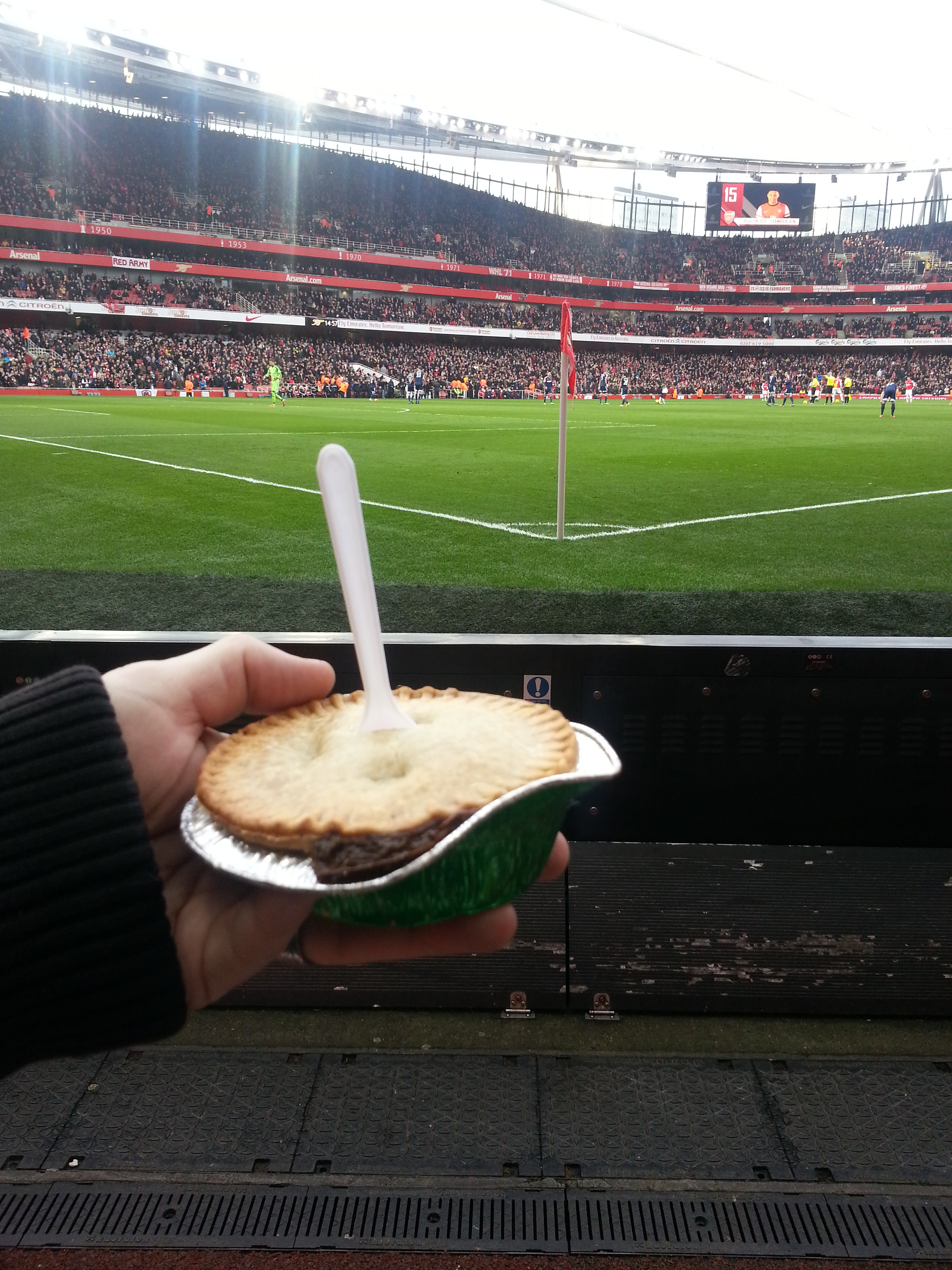 Comments: I remember a few years ago when Arsenal,in keeping with their ticket prices, had those Wembley style of pies that came in a fancy box and were outrageously overpriced mediocrity, however it looks like cost cutting has come into effect with the bank busting deal for bug eyed lightweight Ozil meaning that the club has been reduced to serving bog standard Holland’s pies.