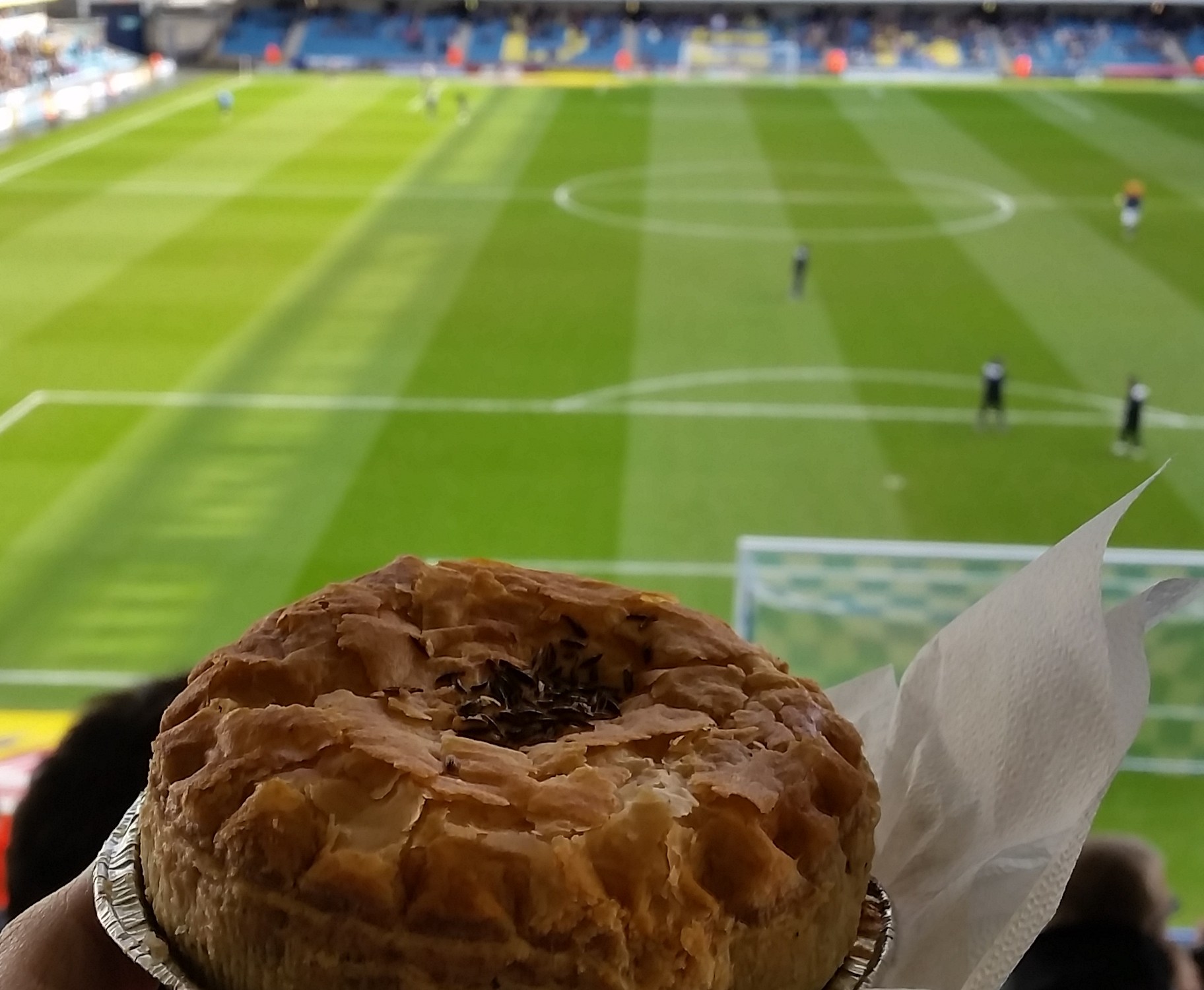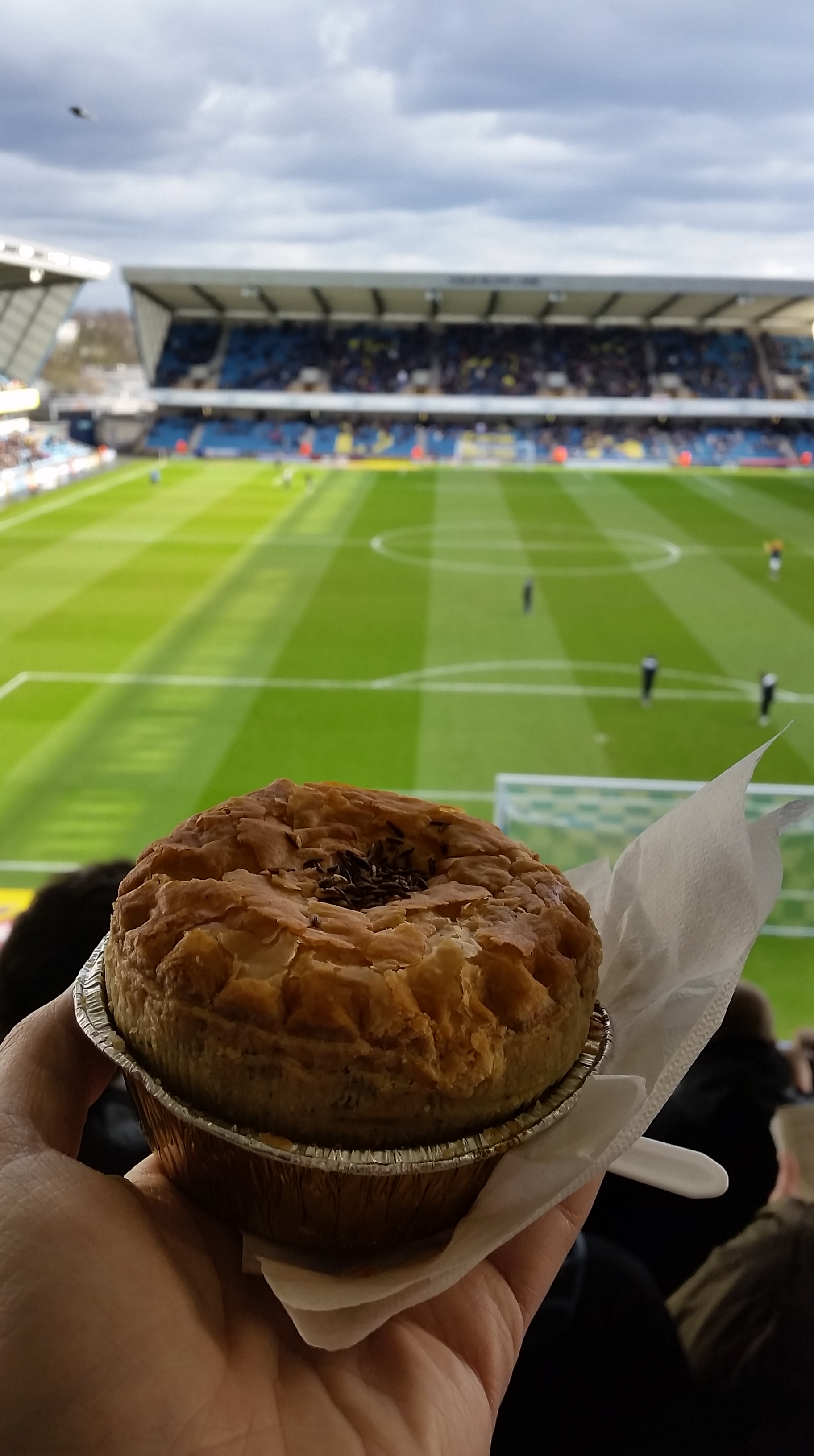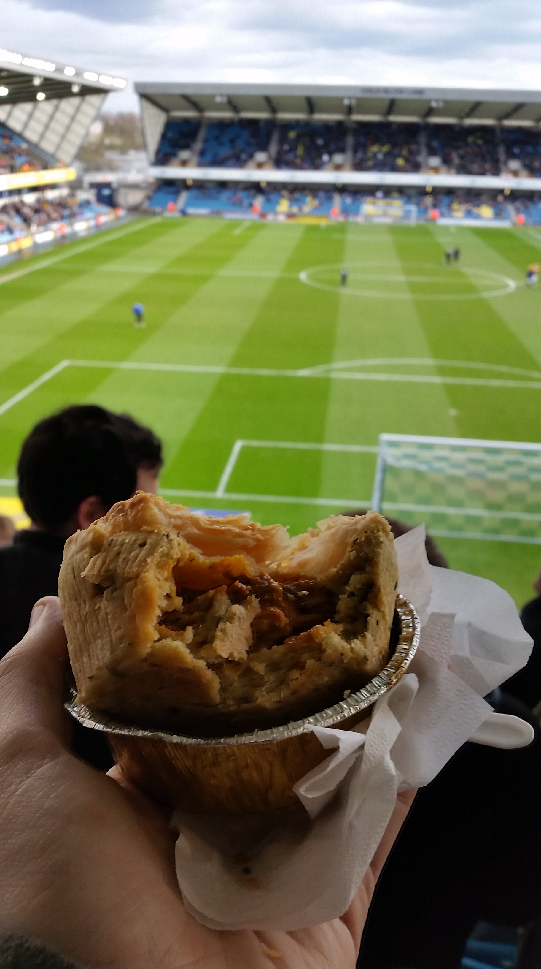 I picked up a nancy boy Balti that, unlike Millwall’s supposed reputation, was soft, fluffy and an all round delight of a pastry. The pie’s inflated top had more puff and colour than Billy Bremner’s tangerine perm, and the added bonus of a fancy sprinkling of seeds on top. Structurally the oval shaped snack was a architectural marvel that would have made Frank Lloyd Wright proud. Straddling that fine line between teeth shatteringly hard and pathetically porous, a fault that means most of the juice dribbles down your Persil white home shirt, this pie was perfectly proportioned to eat mess free in your hand. No Forks needed here.